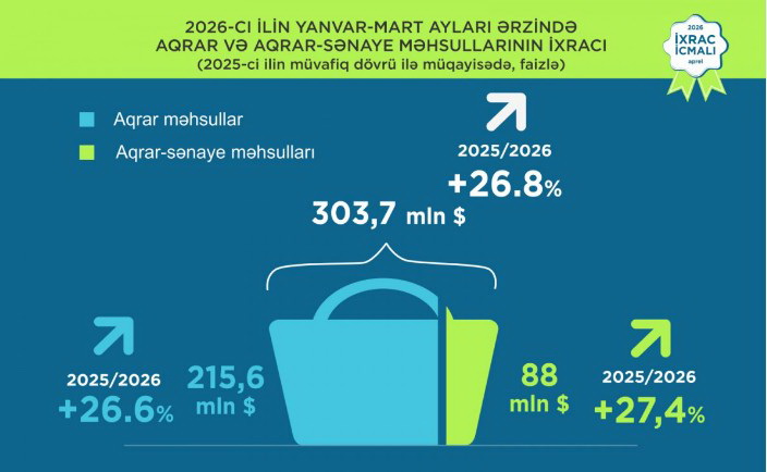 2026-cı ilin yanvar-mart aylarında Azərbaycanın qeyri-neft sektoru üzrə ixracının dəyəri ötən ilin eyni dövrü ilə müqayisədə 11,7 faiz artaraq 862 milyon dollar təşkil edib. Bu dövrdə yeyinti məhsulları üzrə ixrac 25,1 faiz artaraq 281 milyon dollara bərabər olub. Birinci rübdə ixrac olunan şəkər ötən ilin müvafiq dövrünə nəzərən 4,5 dəfə, pambıq iplik 2 dəfə, bitki və heyvan mənşəli piylər və yağlar 68,4 faiz, pambıq lifi 43,5 faiz, meyvə-tərəvəz 22,1 faiz, alüminium və onlardan hazırlanan məmulatlar 20,4 faiz, çay 15,1 faiz, spirtli və spirtsiz içkilər isə 4,3 faiz artıb. Ümumilikdə, dövr ərzində aqrar məhsullar üzrə ixrac 26,6 faiz artaraq 215,6 milyon dollar, aqrar-sənaye məhsulları üzrə ixrac isə 27,4 faiz artaraq 88 milyon dollar təşkil edib. Toplam dəyər ifadəsi ilə aqrar və aqrar-sənaye məhsullarının birgə ixracı 26,8 faiz artaraq 303,7 milyon dollara bərabər olub.