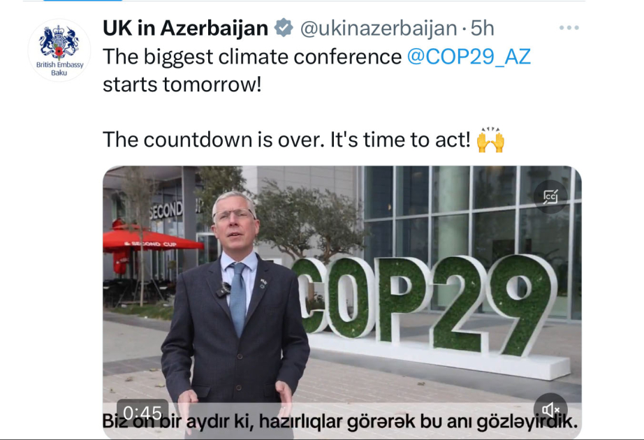 Britaniya səfiri COP29 ilə bağlı paylaşım edib