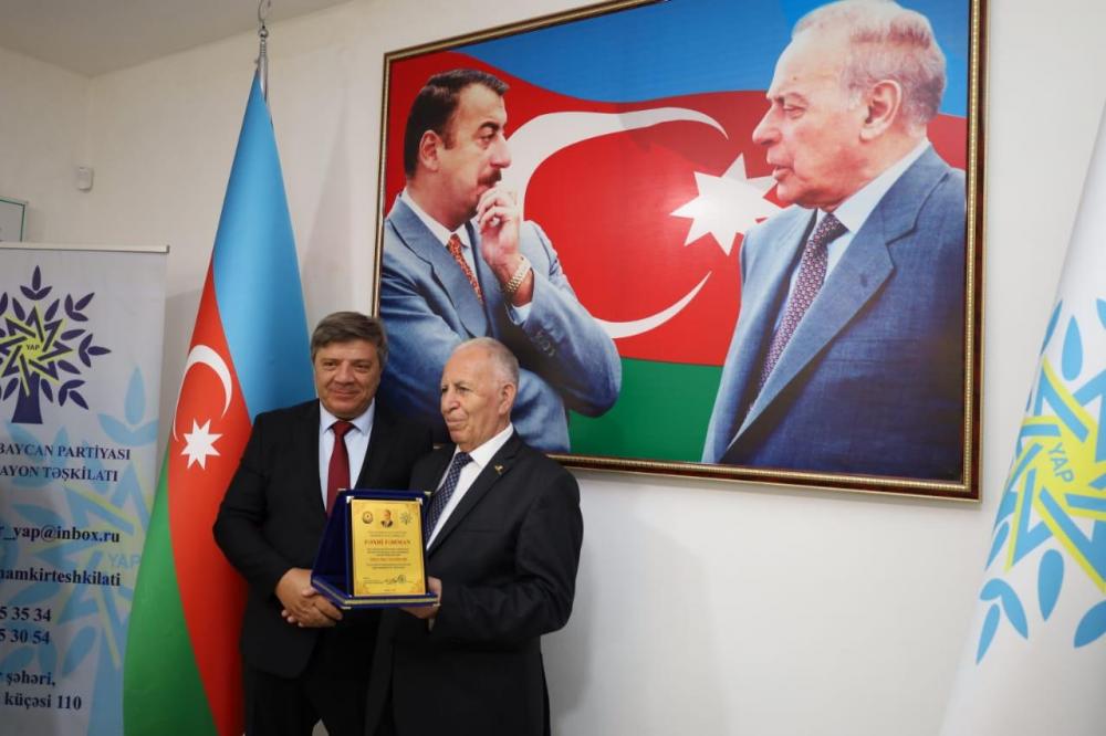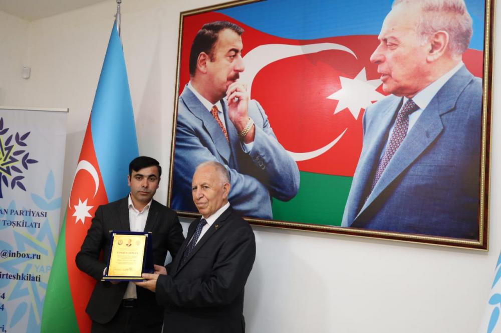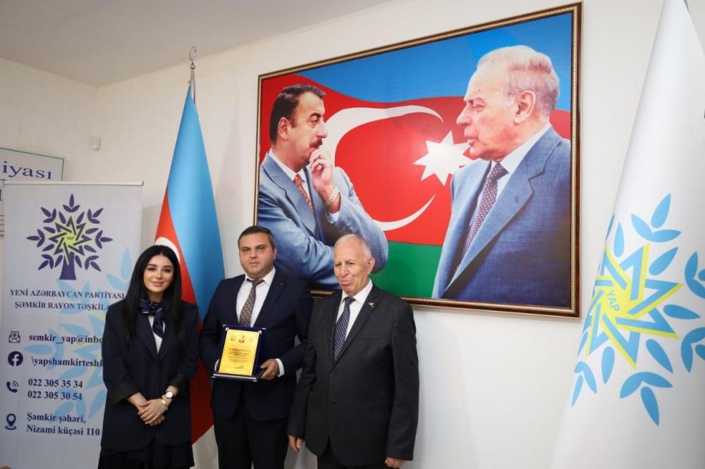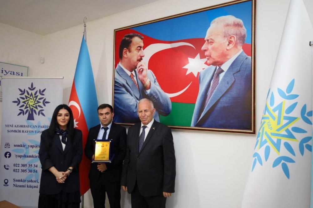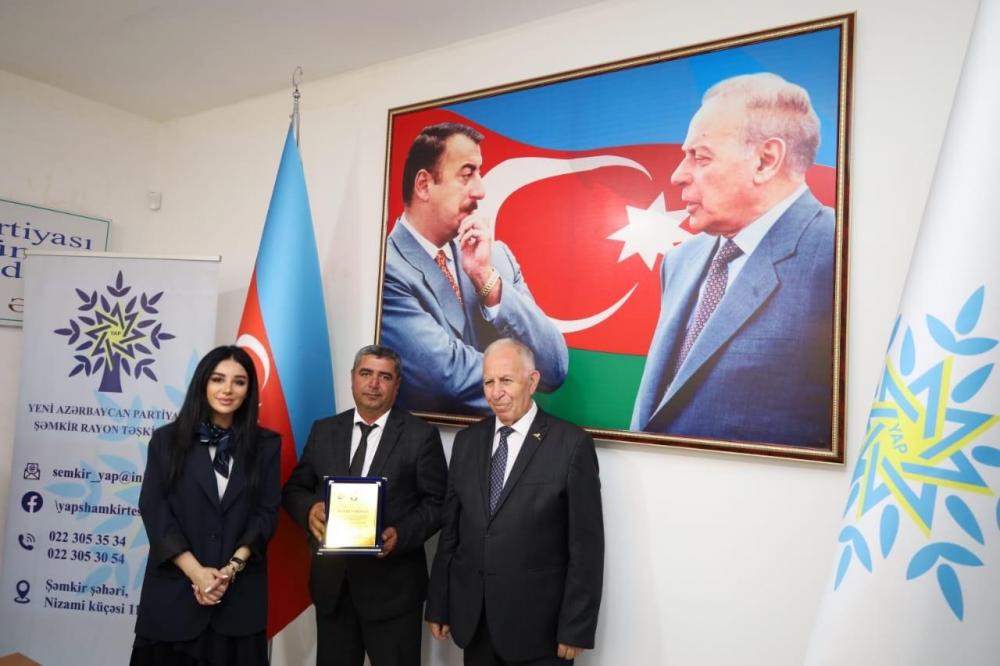 Tədbir çərçivəsində dövlət qulluğunda fərqlənən rayon İcra Hakimiyyətinin və inzibati ərazi dairəsi üzrə nümayəndəliklərin əməkdaşları, rayonun digər qurumlarında dövlət qulluğunda çalışanlar bir qrup şəxslər YAP Şəmkir rayon təşkilatının Fəxri Fərmanları ilə təltif edildilər.