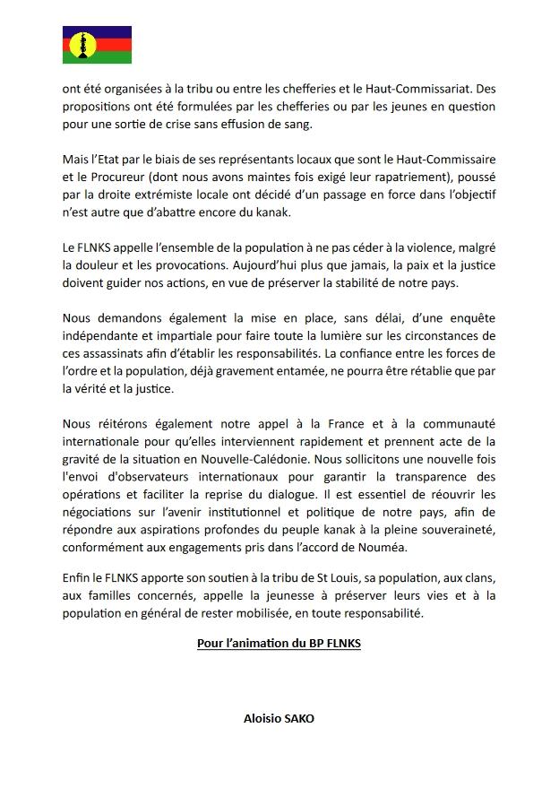 Nəhayət, FLNKS Sent-Luis qəsəbəsinə, onun əhalisinə, aidiyyəti ailələrə öz dəstəyini verir, gəncləri öz həyatlarını qorumağa və ümumilikdə əhalini tam məsuliyyətlə səfərbər olmağa çağırırıq".