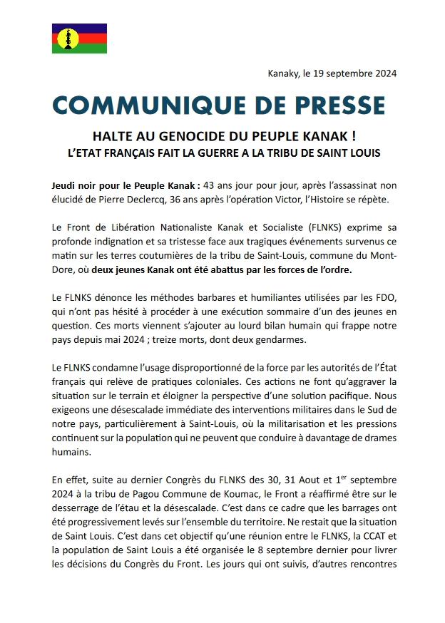 FLNKS (Kanak Sosialist Milli Azadlıq Cəbhəsi) bu səhər Mont Dore kommunası olan Sent-Lui qəbiləsinə aid ərazidə iki gənc kanakın hüquq-mühafizə orqanları tərəfindən güllələnməsi ilə əlaqədar olaraq baş vermiş faciəli hadisəyə görə dərin qəzəb və kədərini bildirir.