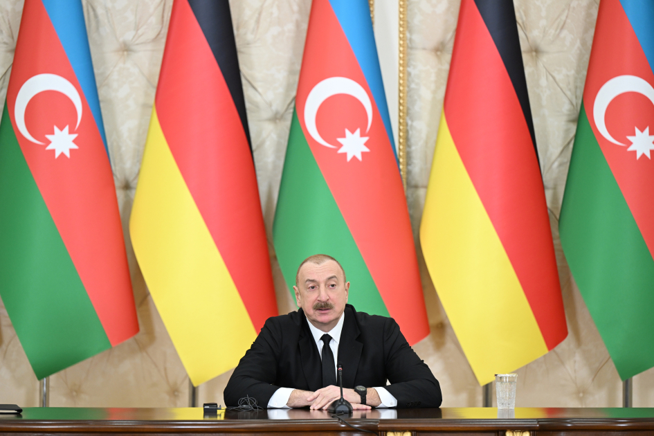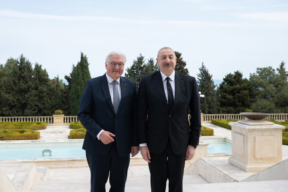 -Hörmətli həmkarım cənab Prezident, bu səmimi dəvətə görə ürəkdən çox təşəkkür edirəm və qonaqpərvərliyə görə bütün alman nümayəndə heyətinin adından təşəkkür edirəm. Biz burada bundan çox zövq alırıq. Siz dediniz ki, Azərbaycanda birinci dəfə deyiləm, bu funksiyada ilk dəfəyəm. Prezident kimi birinci dəfə gəlirəm. Əvvəllər Azərbaycanda dəfələrlə olmuşam. Amma axırıncı dəfə 2016-cı ildə olub, doqquz il keçib üstündən. İndi dünyada vəziyyət elə tez dəyişir, geosiyasi baxımdan 9 ildə o qədər dəyişikliklər olub ki, 2016-cı ildə buraya səfərim mənə artıq uzaq keçmiş kimi görünür. Ona görə şadam ki, bu gün yenidən gəlib görüşdük və çox geniş fikir mübadiləsi apara bildik. Biz həmişə bu mübadiləni aparmışıq. Bakıda olmasa da, başqa yerlərdə görüşmüşük, telefonla söhbət etmişik. Bu aralarda Münxen Təhlükəsizlik Konfransında görüşmüşük, eləcə də Sizin Berlinə səfərinizi yaxşı xatırlayıram. Keçən il baş tutan bu görüşdə müzakirə aparmışıq və şadam ki, mən indi Sizin səfərinizin qarşılığı olaraq ölkənizdə səfərdəyəm.
