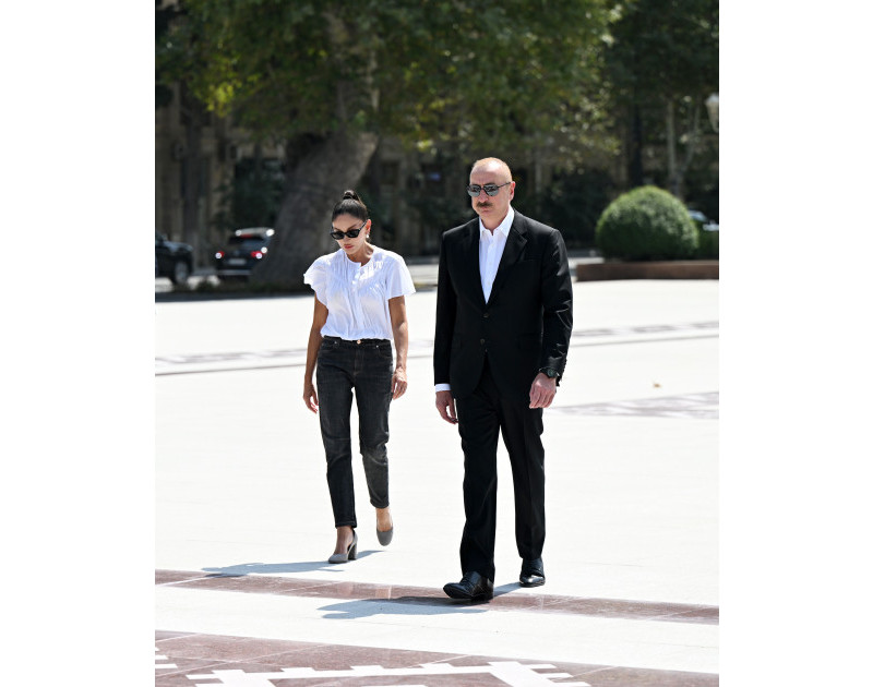 Dövlətimizin başçısı və birinci xanım Ulu Öndər Heydər Əliyevin şəhərin mərkəzində ucaldılan abidəsini ziyarət edərək, önünə gül dəstələri qoyublar.