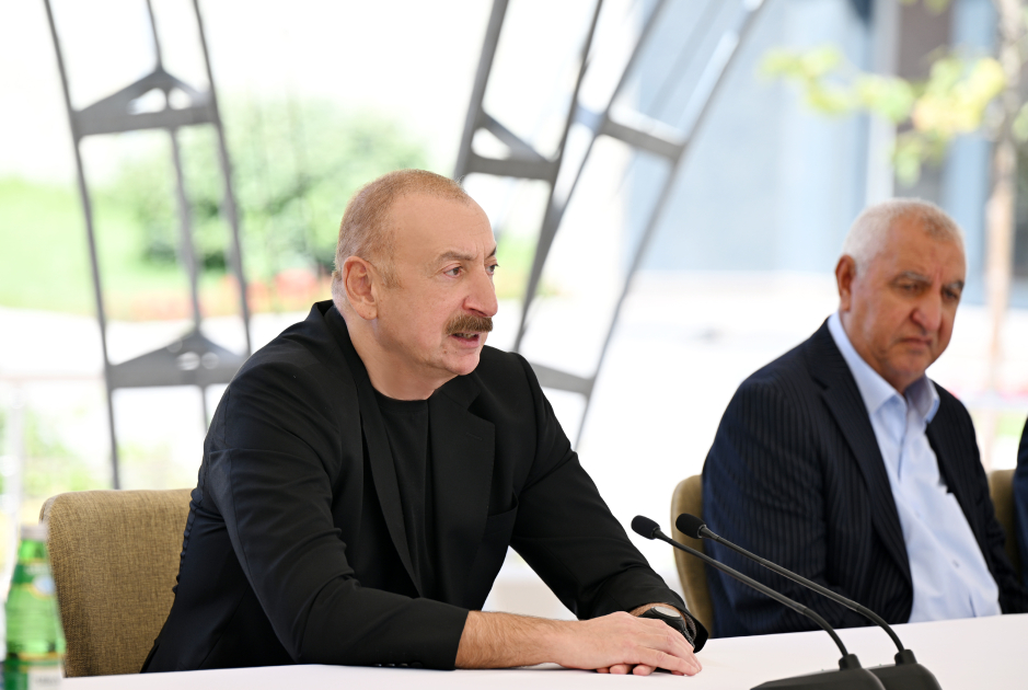 Bizim işimiz quruculuqdur. Onlar bütün şəhər və kəndlərimizi viran qoyublar. Kəlbəcər şəhərində bir dənə salamat bina qalmamışdır. Kəlbəcərin heç bir kəndində bir dənə də bina qalmamışdır. O, vəhşilik idi. O, insanlığa sığmayan hərəkət idi və bunu bir nəfər yox, 10 nəfər yox, kütləvi surətdə edirdilər. Onlar gərək bu məsələlərlə məşğul olsunlar, hansı cəmiyyətdə yaşayır Ermənistan? O cəmiyyət ki, işğal dövründə talançılığı özü üçün əsas gəlir mənbəyi etmişdir. Bu cəmiyyət xəstədir və mən bunu açıq deyirəm. Mən heç kimi təhqir etmək istəmirəm. Biz onlara nə etmişik ki, nə pislik etmişik ki, bu qədər vəhşiliklə üz-üzə qalaq?! Bütün şəhər və kəndlər dağıdılıb, məscidlər dağıdılıb, təhqir edilib, insanlar qətlə yetirilib, öldürülüb, yandırılıb. Hətta İkinci Qarabağ müharibəsindən sonra bizdən vasitəçilər tərəfindən vaxt istəmişdilər, burada öz şələ-şülələrini yığmaq üçün. Biz hətta vaxt da verdik onlara. Nə etdilər? Yandırdılar, ağacları qırdılar. İnsan bunu edər? Axı, bunu təkcə separatçıların başçıları etməyiblər. Kütləvi surətdə ediblər. Yəni, biz bilməliyik ki, kiminlə üz-üzəyik, bizim qonşumuz kimdir. Keçmişimizi heç vaxt unutmamalıyıq və ayıq olmalıyıq. Əminəm ki, bütün bu amillər imkan verəcək ki, üstünlük hər zaman bizdə olsun. Bu gün bunu yenə də deyirəm, biz qalib xalq kimi bəyan edirik. Biz o pisliyi, vəhşiliyi unutmayacağıq. Ancaq biz bundan sonra heç kimlə müharibə aparmaq fikrində deyilik. Əgər bizə qarşı hər hansı bir təhlükə çıxarsa, onda yenə də bizim “dəmir yumruğ”umuzu hər kəs görəcək. Bu gün bu gözəl binaların ətrafında bizim görüşümüz də çox böyük rəmzi məna daşıyır. Onlar buranı dağıdıblar, biz isə qurub-yaratmışıq və sizi bu münasibətlə bir daha təbrik edirəm. Rahat yaşayın, sizə cansağlığı, xoşbəxtlik arzulayıram. Sağ olun.