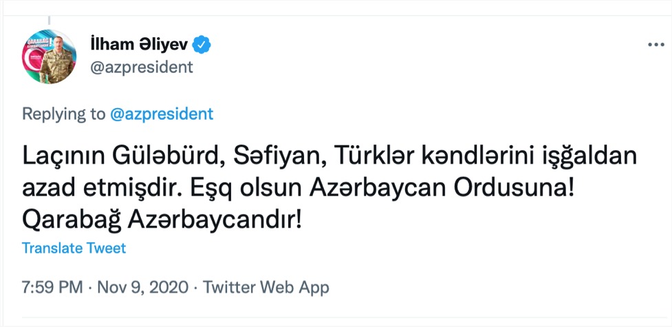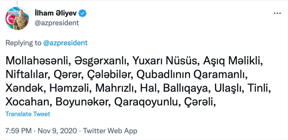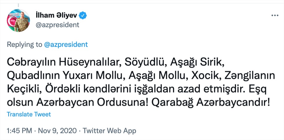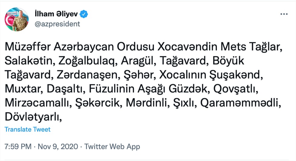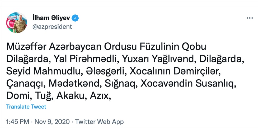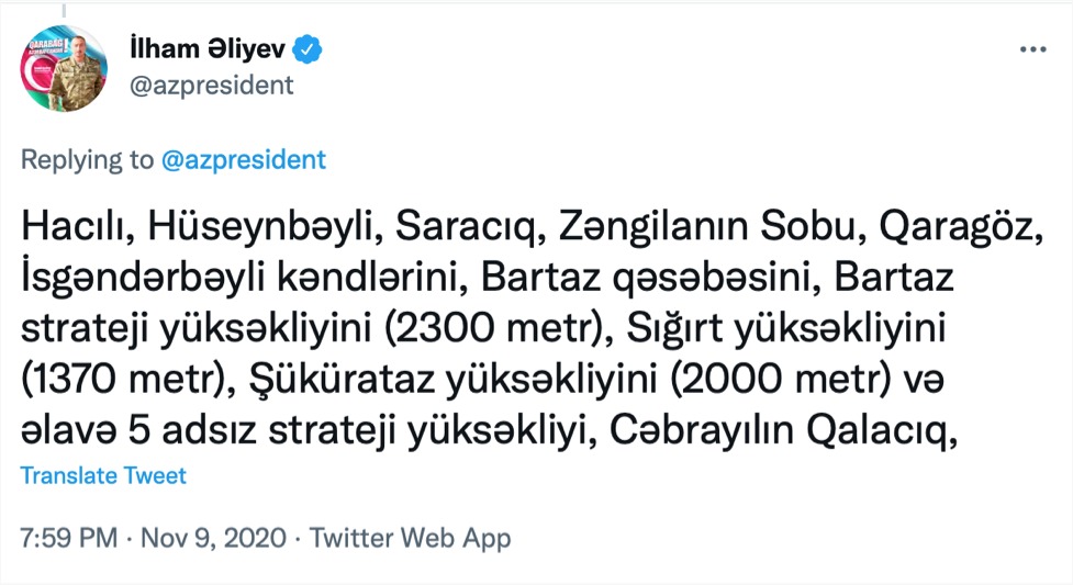 Nəhayət, bəlkə də 44 günlük Vətən müharibəsinin ən çox gözlənilən anı gəlib çatdı - 8 noyabr... Həmin gün Azərbaycan Ordusunun keçirdiyi uğurlu əməliyyatlar nəticəsində Şuşa şəhəri işğaldan azad olundu. Prezident İlham Əliyev bu münasibətlə xalqa müraciət etdi. Noyabrın 9-da isə Prezident İlham Əliyev özünün “Twitter” səhifəsində Füzuli rayonunun Qobu Dilağarda, Yal Pirəhmədli, Yuxarı Yağlıvənd, Dilağarda, Seyid Mahmudlu, Ələsgərli, Xocalı rayonunun Dəmirçilər, Çanaqçı, Mədətkənd, Sığnaq, Xocavənd rayonunun Susanlıq, Domi, Tuğ, Akaku, Azıx, Cəbrayıl rayonunun Hüseynalılar, Söyüdlü, Aşağı Sirik, Qubadlı rayonunun Yuxarı Mollu, Aşağı Mollu, Xocik, Zəngilan rayonunun Keçikli, Ördəkli kəndlərinin işğaldan tam azad edildiyini açıqladı. Bundan başqa, Prezident İlham Əliyev özünün “Twitter” səhifəsində Xocavənd rayonunun Böyük Tağlar, Salakətin, Zoğalbulaq, Arakül, Tağaverd, Böyük Tağaverd, Zərdanaşen, Şexer, Xocalı rayonunun Şuşakənd, Muxtar, Daşaltı, Füzuli rayonunun Aşağı Güzdək, Govşatlı, Mirzəcamallı, Şəkərcik, Merdinli, Şıxlı, Qaraməmmədli, Dövlətyarlı, Hacılı, Hüseynbəyli, Saracıq, Zəngilan rayonunun Sobu, Qaragöz, İsgəndərbəyli kəndlərinin, Bartaz qəsəbəsinin, Bartaz strateji yüksəkliyinin (2300 metr), Sığırt yüksəkliyinin (1370 metr), Şükürataz yüksəkliyinin (2000 metr) və əlavə 5 adsız strateji yüksəkliyin, Cəbrayıl rayonunun Qalacıq, Mollahəsənli, Əsgərxanlı, Yuxarı Nüsüs, Aşıq Məlikli, Niftalılar, Qərər, Çələbilər, Qubadlı rayonunun Qaraimanlı, Xəndək, Həmzəli, Mahrızlı, Hal, Ballıqaya, Ulaşlı, Tinli, Xocahan, Boyunəkər, Qaraqoyunlu, Çərəli, Laçın rayonunun Güləbird, Səfiyan, Türklər kəndlərinin işğaldan tam azad edildiyini açıqladı.