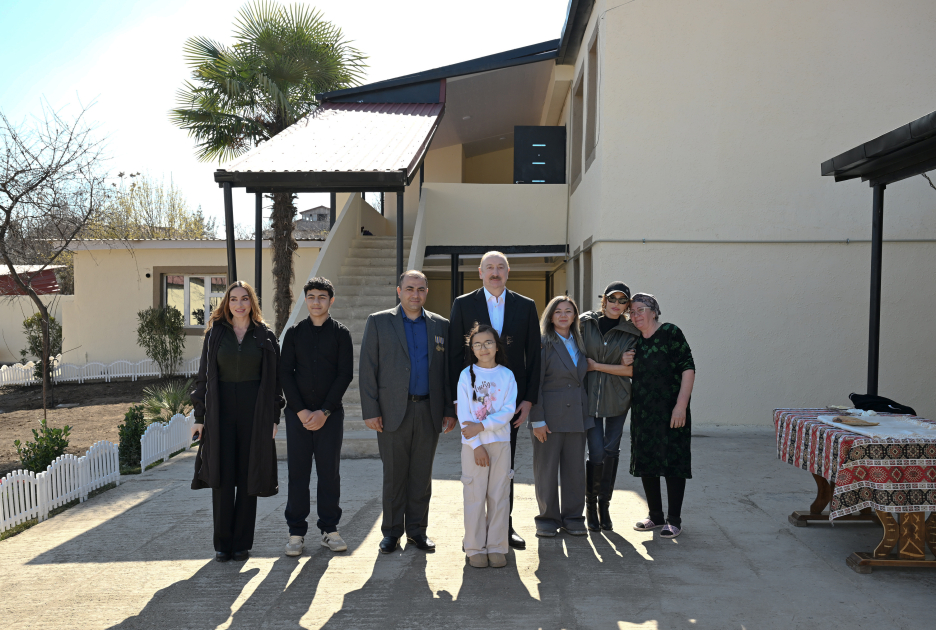 Sonra Prezident İlham Əliyev, birinci xanım Mehriban Əliyeva və qızları Arzu Əliyeva Xocavənd şəhərinə köçmüş İlqar Həsənovun evində oldular və söhbət etdilər.