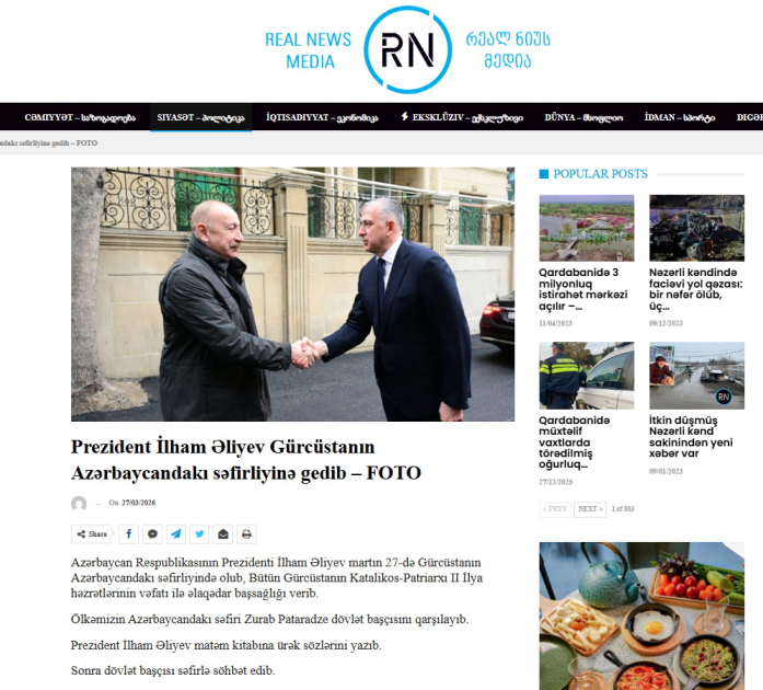 Gürcüstanın aparıcı imedi.ge, interpressnews.ge, realnews.ge, interpress.ge, 1tv.ge informasiya portalları, eləcə də ictimai televiziyası Azərbaycan Prezidenti İlham Əliyev martın 27-də Gürcüstanın ölkəmizdəki səfirliyində olması və Bütün Gürcüstanın Katalikos-Patriarxı II İlya həzrətlərinin vəfatı ilə əlaqədar başsağlığı verməsi barədə mlumat yayıblar.