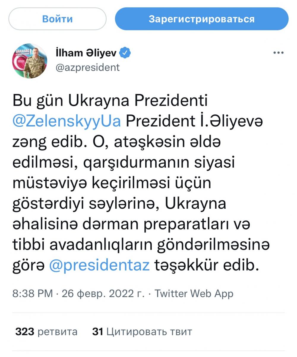 Как сообщает Report, об этом написал президент Азербайджанской Республики Ильхам Алиев на своей официальной странице в Twitter.