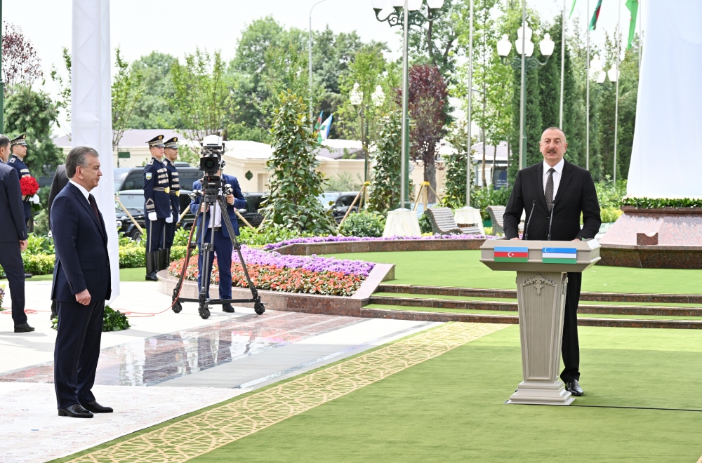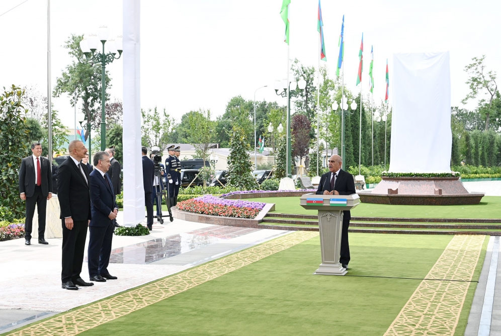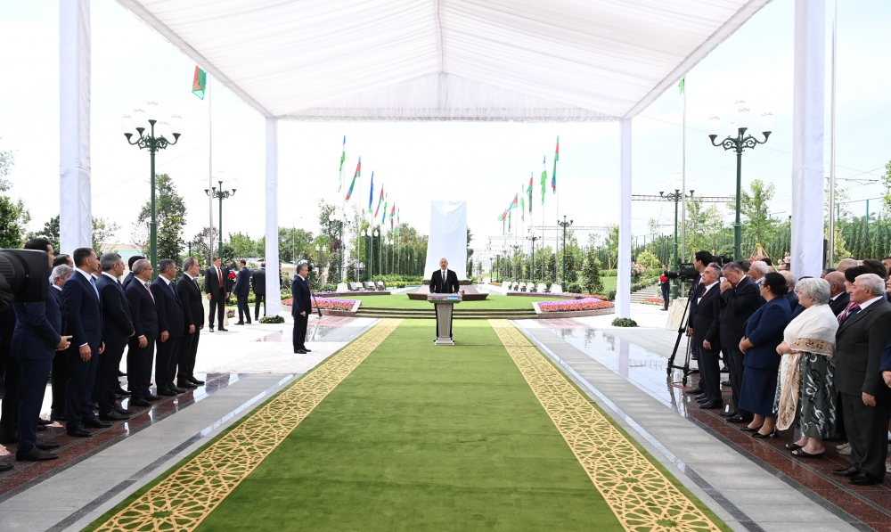 Я очень благодарен моему дорогому брату Шавкату Миромоновичу за инициативу, за создание такого прекрасного уголка в центре Ташкента, посвящённого памяти Гейдара Алиева, моего отца. Улица, площадь, барельеф, прекрасный парк – это истинно братское отношение к памяти великого лидера азербайджанского народа, ко всему азербайджанскому народу. Мы в Азербайджане это очень высоко ценим, очень благодарны, и видим в этом истинно братское отношение наших узбекских братьев к нашему великому лидеру, к нашей общей истории. Это также уважение ко всему азербайджанскому народу, которому Гейдар Алиев посвятил всю свою жизнь. Я очень благодарен Шавкату Миромоновичу за теплые слова о моем отце. Он очень ёмко и точно охарактеризовал нашего лидера. Гейдар Алиев посвятил всю свою жизнь служению Азербайджану, и в советское время, и во времена независимости был всегда рядом с народом. В самые тяжелые времена, во времена, когда наш народ подвергался агрессии, наш народ подвергался гонениям, он всегда стоял рядом с народом. 20 января 1990 года, еще почти за два года до того, как Советский Союз распался, он публично осудил советское руководство в связи с вводом советской армии в Баку и убийством и ранением сотен невинных граждан Азербайджана. Это требовало большого политического мужества. Потому что тогда еще было неизвестно сколько осталось до того, как Советский Союз уйдет в историю. Он это сделал. Он также был со своим народом в самые тяжелые времена, когда Нахчыванская Автономная Республика подвергалась агрессии, и, возглавив Нахчыванскую Автономную Республику, по существу защитил этот исторический кусок Азербайджана, древнюю землю от агрессии. Также именно по его инициативе флаг Азербайджанской Демократической Республики, которая существовала с 1918 по 1920-е годы, официально был признан государственным флагом именно в Нахчыване еще задолго до того, как Советского Союза не стало и Азербайджан восстановил свою независимость.