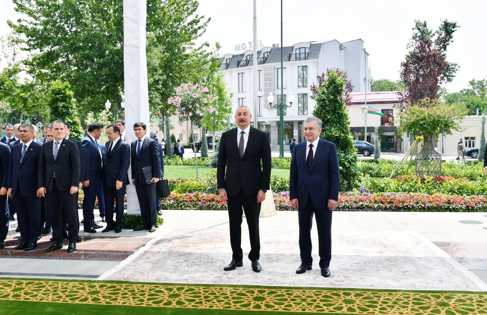После этого Президент Ильхам Алиев и Президент Шавкат Мирзиёев возложили цветы к мемориальному комплексу.