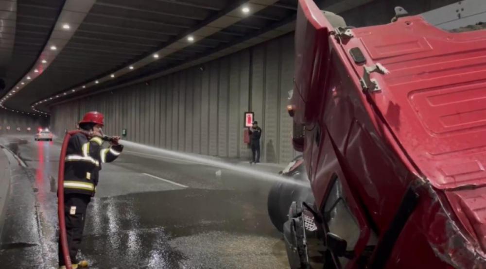/ / FHN: Bakıda tuneldə qəza törədən yük maşınının yanacağı ətrafa dağılıb, yanğın-partlayış təhlükəsi yaranıb