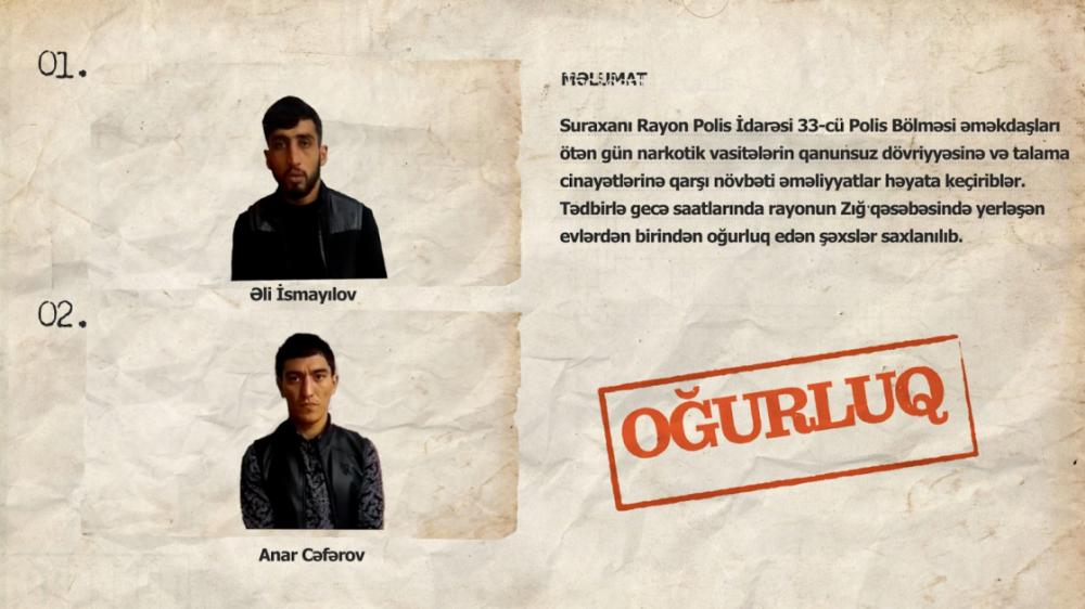 Keçirilən digər tədbir zamanı oğurluq cinayəti törədən əvvəllər məhkum olunmuş 20 yaşlı Anar Cəfərov və 27 yaşlı Əli İsmayılov saxlanılıblar. Onlar gecə saatlarında rayonun Zığ qəsəbəsində yerləşən evlərdən birinin pəncərəsini qıraraq mənzildən pul, qızıl-zinət əşyaları və mobil telefon oğurlayıblar.