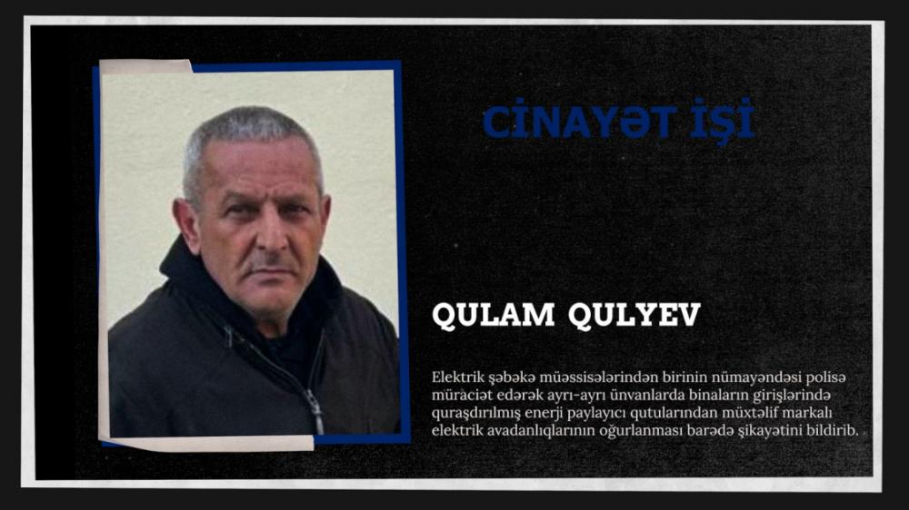Nizami Rayon Polis İdarəsinin 24-cü Polis Şöbəsinin əməkdaşları tərəfindən keçirilən tədbirlərlə talama cinayətlərini törətmiş əvvəllər dəfələrlə məhkum olunan 63 yaşlı Qulam Qulyev saxlanılıb. Onun oğurladığı avadanlıqların bir hissəsi tapılaraq maddi sübut kimi götürülüb.