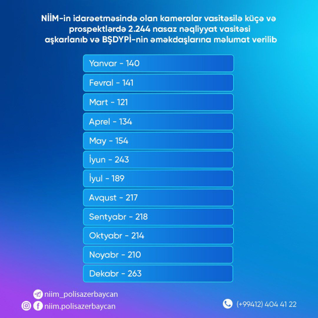 Daxili İşlər Nazirliyinin (DİN) Nəqliyyatı İntellektual İdarəetmə Mərkəzinin (NİİM) paytaxt yollarında quraşdırılmış videomüşahidə kameralarının görünüş dairəsində ötən il ərzində 2 min 012 yol-nəqliyyat hadisəsi qeydə alınıb. Müvafiq tədbirlər görülməsi üçün dərhal Bakı Şəhər Dövlət Yol Polisi İdarəsinin əməkdaşlarına məlumat verilib.