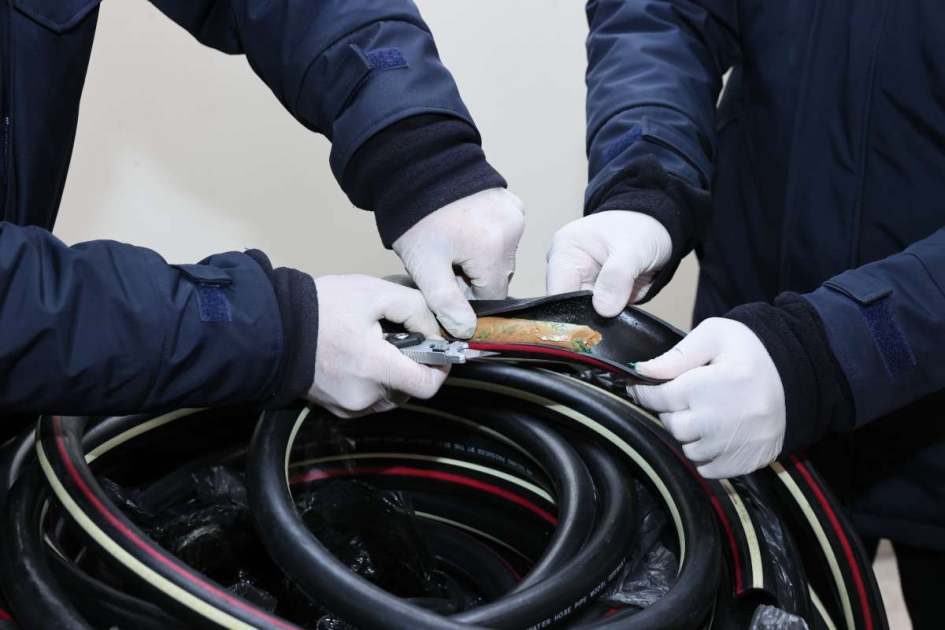 İran İslam Respublikasından yük nəqliyyat vasitəsində daşıyıcı şirkət vasitəsilə idxal olunan yüklərə Bakı Baş Gömrük İdarəsinin “İpək Yolu” gömrük postunda rentgen qurğusunda baxış keçirilib və bir ədəd qara rəngli sellofan torbada olan rezin boruların içərisində şübhəli cizgilər müşahidə edilib.