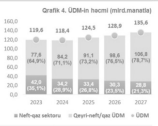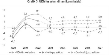 Onu da qeyd edək ki, Azərbaycan hökumətinin yaxın 3 illiksosial-iqtisadi inkişaf proqnozları ilə beynəlxalq iqtisaditəşkilatların artım gözləntiləri üst-üstə düşür. Hökumətinproqnozlarına əsasən, 2024-cü ildə ÜDM real ifadədə 2,4 faiz artaraq 118,4 milyard olacaq, 2025-ci ildə 2,9 faiz, 2026-cı ildə 2,7 faiz, 2027-ci ildə isə 3,6 faiz təşkil edəcək. Qeyri-neft ÜDM-i isə 2024-cü ildə 4,6 faiz, 2025-ci ildə 2,7 faiz, 2026-cı ildə 4,9 faiz, 2027-ci ildə isə 5 faizə bərabər olacaq.