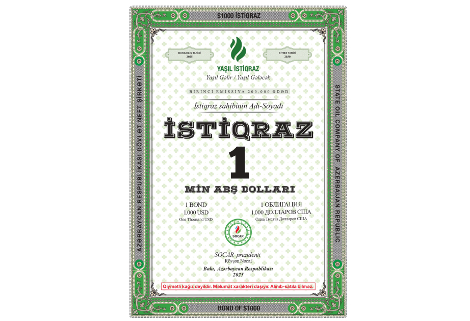 SOCAR-dan AZƏRTAC-a bildirilib ki, nominal dəyəri 1000 (min) dollar olan istiqrazlar sahiblərinə illik 6 faiz gəlir qazandıracaq. Ümumi buraxılış məbləği 200 milyon dollar olan və 5 illik müddətə buraxılan “yaşıl istiqraz”ların kupon ödənişləri hər 3 aydan bir ödəniləcək. SOCAR-ın “yaşıl istiqraz”larını əldə etmək üçün son tarix 2025-ci il fevralın 28-dir.