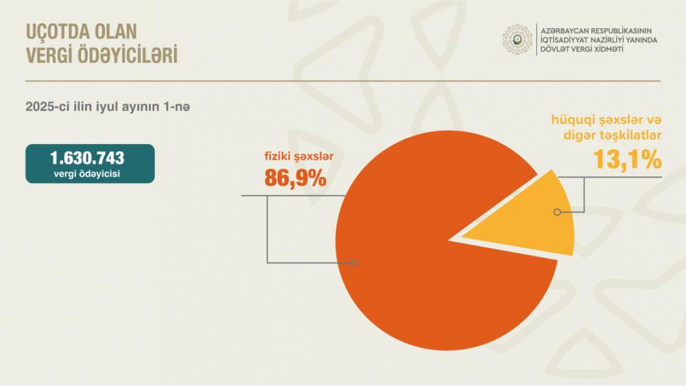 2025-ci il iyul ayının 1-nə respublika üzrə uçotda olan 1 milyon 630 min 743 vergiödəyicisinin 86,9 faizi fiziki şəxslər, 13,1 faizi hüquqi şəxslər və digər təşkilatlar olub.