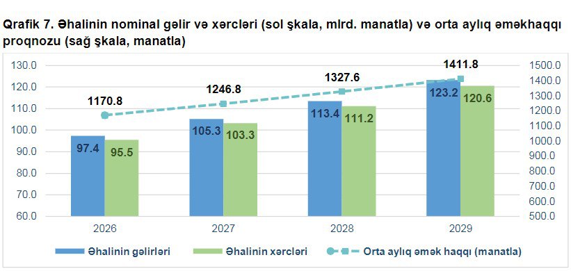 Büdcənin gəlir və xərcləri, ümumilikdə büdcə ssenariləri birbaşa ölkənin inkişaf gözləntilərinə əsaslandığından 2026-cı ilin və növbəti 3 ilin büdcə siyasəti çərçivəsi də məhz ölkə iqtisadiyyatının artım bazislərinə söykənəcək. Ortamüddətli dövr üzrəmakroiqtisadi proqnozlar isə kifayət qədər ümidvericidir. Belə ki, İqtisadiyyat Nazirliyi tərəfindən cari ilin avqust ayında təqdim olunan proqnozlara əsasən, baza ssenaridə neftin bir barrelinin orta illik ixrac qiyməti 2026-2029-cu illər üzrə 65 ABŞ dolları olacağı fərz edilir. Proqnozlara görə, 2026-cı ilin sonuna ÜDM-in həcminin134,1 milyard manat, o cümlədən qeyri-neft-qaz ÜDM-nin 101,7 milyard manat təşkil edəcəyi gözlənilir. 2029-cu ildə isə ÜDM-in 161,8 milyard manata, qeyri-neft-qaz ÜDM-nin isə 129,5 milyard manata çatacağı proqnozlaşdırılır. Ortamüddətli dövrdə ÜDM-in real artım tempinin orta illik 3,5 faiz, qeyri-neft-qaz ÜDM-in isə 4,9 faiz olacağı gözlənilir. İqtisadiyyatın əsas hərəkətverici drayverləri qeyri-neft sektorunun üzərində fokuslanması sayəsində 2029-cu ildə ÜDM-in tərkibində qeyri-neft-qaz sektorunun payı artaraq 80 faizə çatacaq.