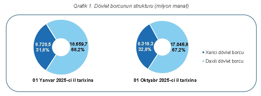 Maliyyə Nazirliyi yanında Dövlət Borcunun və Maliyyə Öhdəliklərinin İdarə Edilməsi Agentliyi tərəfindən 2025-ci ilin 9 ayı üzrə dövlət borcuna dair hesabat hazırlanıb. Sənəd dövlət borcu sahəsində şəffaflığın təmin olunması, dövlət borcu ilə bağlı ictimaiyyətə açıqlanan informasiya dairəsinin genişləndirilməsi və bu sahə üzrə məlumatlara əlçatanlığın təmin edilməsi məqsədilə dərc olunub. Agentliyin hesabatına əsasən, 2025-ci il oktyabrın 1-nə olan dövrdə, Azərbaycanın daxili və xarici borc olmaqla cəmi dövlət borcu 25 milyard 365 milyon manat olmaqla ÜDM-in 19,5 faizini təşkil edir. Maliyyə Nazirliyinin açıqladığı hesabata əsasən, borc portfelinin 8,3 milyard manatı (4,9 milyard dollar) və ya 32,8 faizi xarici dövlət borcunun (ÜDM-in 6,5 faizi ), 17 milyard manatı və ya 67,2 faizi daxili dövlət borcunun (ÜDM-in 13,1 faizi) payına düşür. Xarici dövlət borcu 2025-ci il yanvarın 1-nə olan tarixlə müqayisədə 236,6 milyon manat, daxili dövlət borcu isə 1 milyard 612,9 milyon manat azalıb. Hesabat tarixinə daxili dövlət borcunun 7, 9 milyard manatı dövriyyədə olan dövlət qiymətli kağızlarının, 9,1 milyard manatı isə hökumətin üzərinə götürdüyü dövlət zəmanətli öhdəliklərin payına düşür.