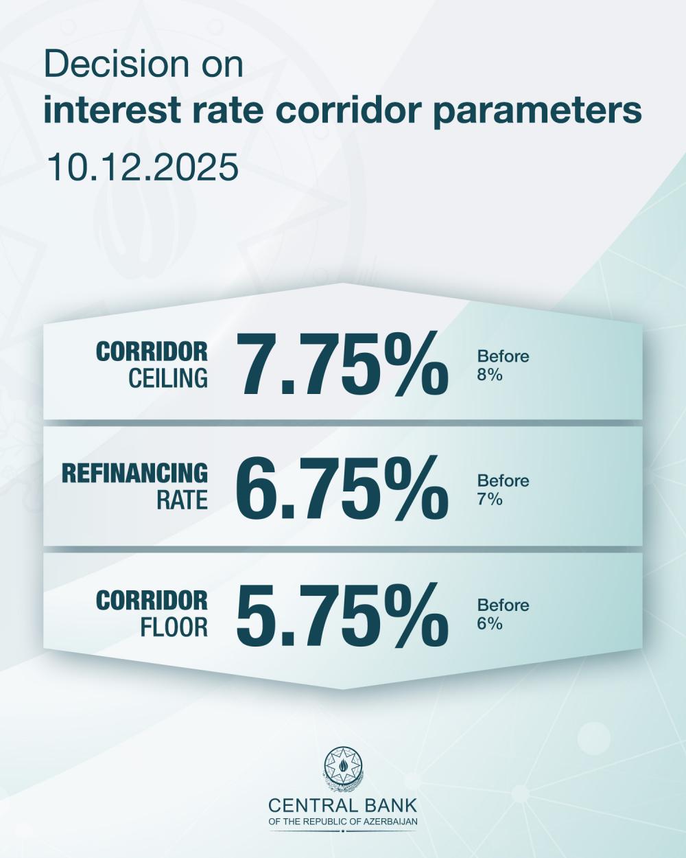 Mərkəzi Bank (MB) faiz dəhlizinin bütün parametrləri ilə bağlı növbəti qərarını açıqlayıb. Qərara əsasən, faiz stavkası 0,25 faiz-bənd azaldılıb. Belə ki, uçot dərəcəsi 6,75 faiz, faiz dəhlizinin aşağı həddi 5,75 faiz, dəhlizin yuxarı həddi isə 7,75 faiz səviyyəsinə endirilib. Bu, Mərkəzi Bankın oktyabr ayında elan etdiyi uçot dərəcələri ilə müqayisədə faiz dərəcəsinin azaldılması deməkdir. Belə ki, MB-nın bundan əvvəlki qərarına əsasən, uçot dərəcəsi 7 faiz, faiz dəhlizinin aşağı həddi 6 faiz, faiz dəhlizinin yuxarı həddi isə 8 faiz səviyyəsində müəyyənləşmişdi. Yeni qərardan sonra bank, maliyyə və kredit sektorunda daha yumşaq kredit siyasəti təmin olunacaq.