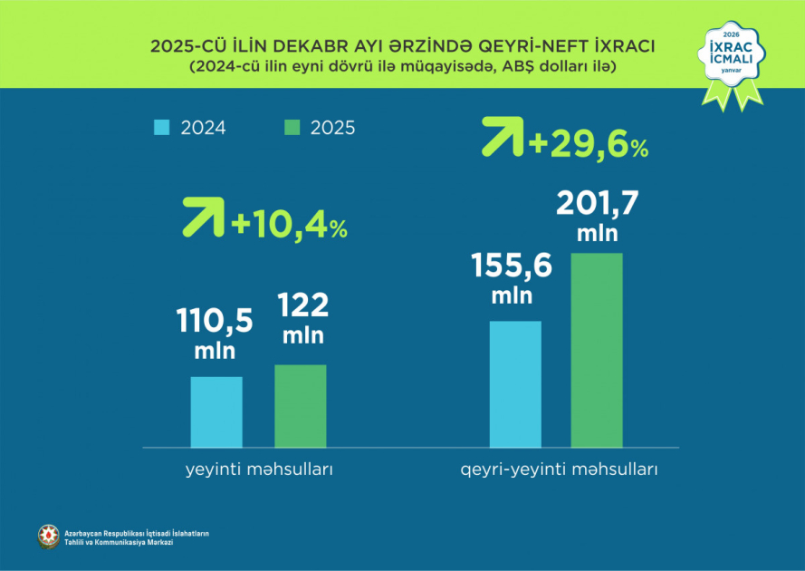 2025-ci ilin yanvar-dekabr aylarında Azərbaycanın qeyri-neft sektoru üzrə ixracı 2024-cü ilin müvafiq dövrü ilə müqayisədə 8,5 faiz artaraq 3,6 milyard dollar təşkil edib.