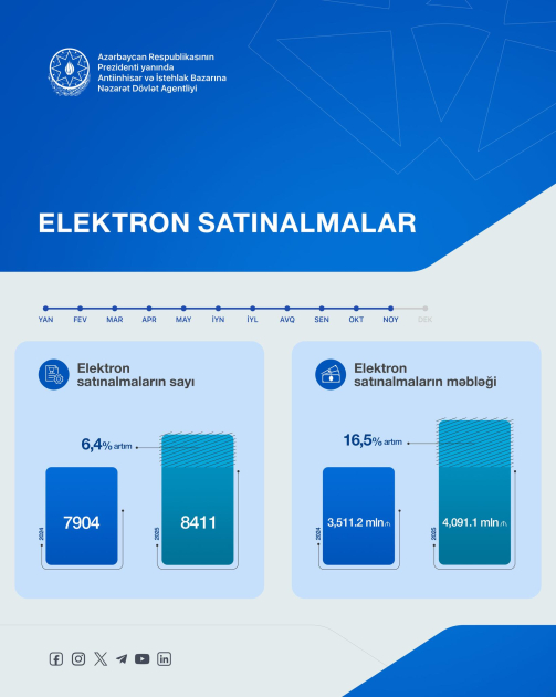 2025-ci ilin yanvar-noyabr ayları ərzində keçirilmiş elektron satınalmaların sayı 8411, məbləği isə 4,1 milyard manat təşkil edib.