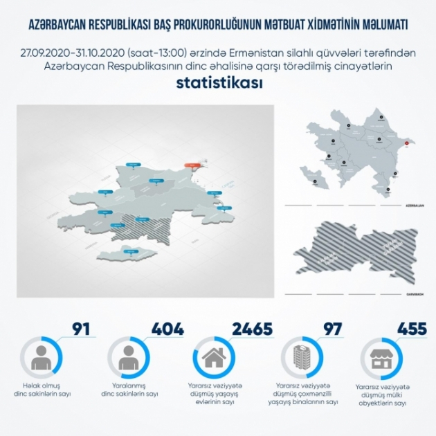 • Ermənistan Silahlı Qüvvələrinin təxribatları nəticəsində sentyabrın 27-dən oktyabrın 31-i saat 13:00-dək 91 mülki şəxs həlak olub, 404 nəfər yaralanıb, 2465 ev, 97 çoxmənzilli yaşayış binası və 455 mülki obyekt yararsız vəziyyətə düşüb. Bu barədə Baş Prokurorluq məlumat yayıb.
