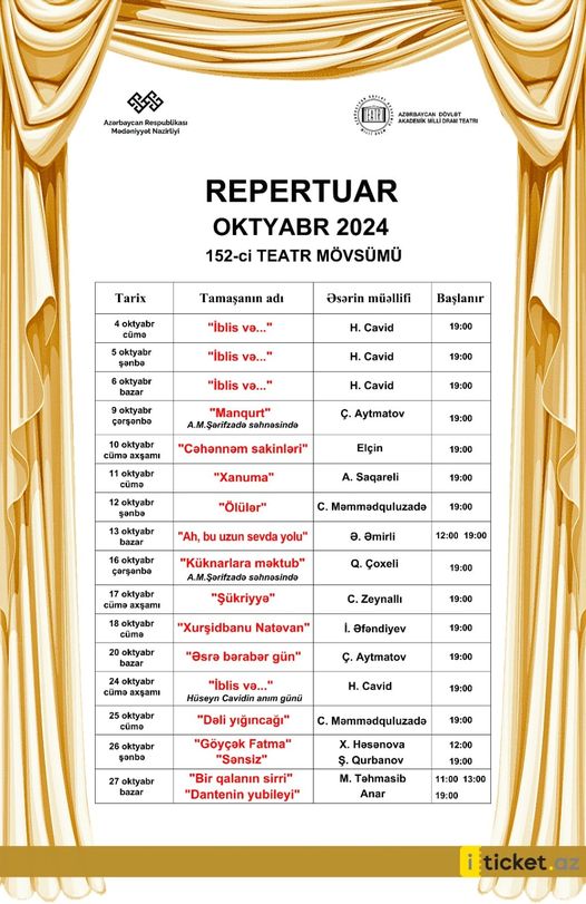 Azərbaycan Dövlət Akademik Milli Dram Teatrının oktyabr repertuarı məlum olub.