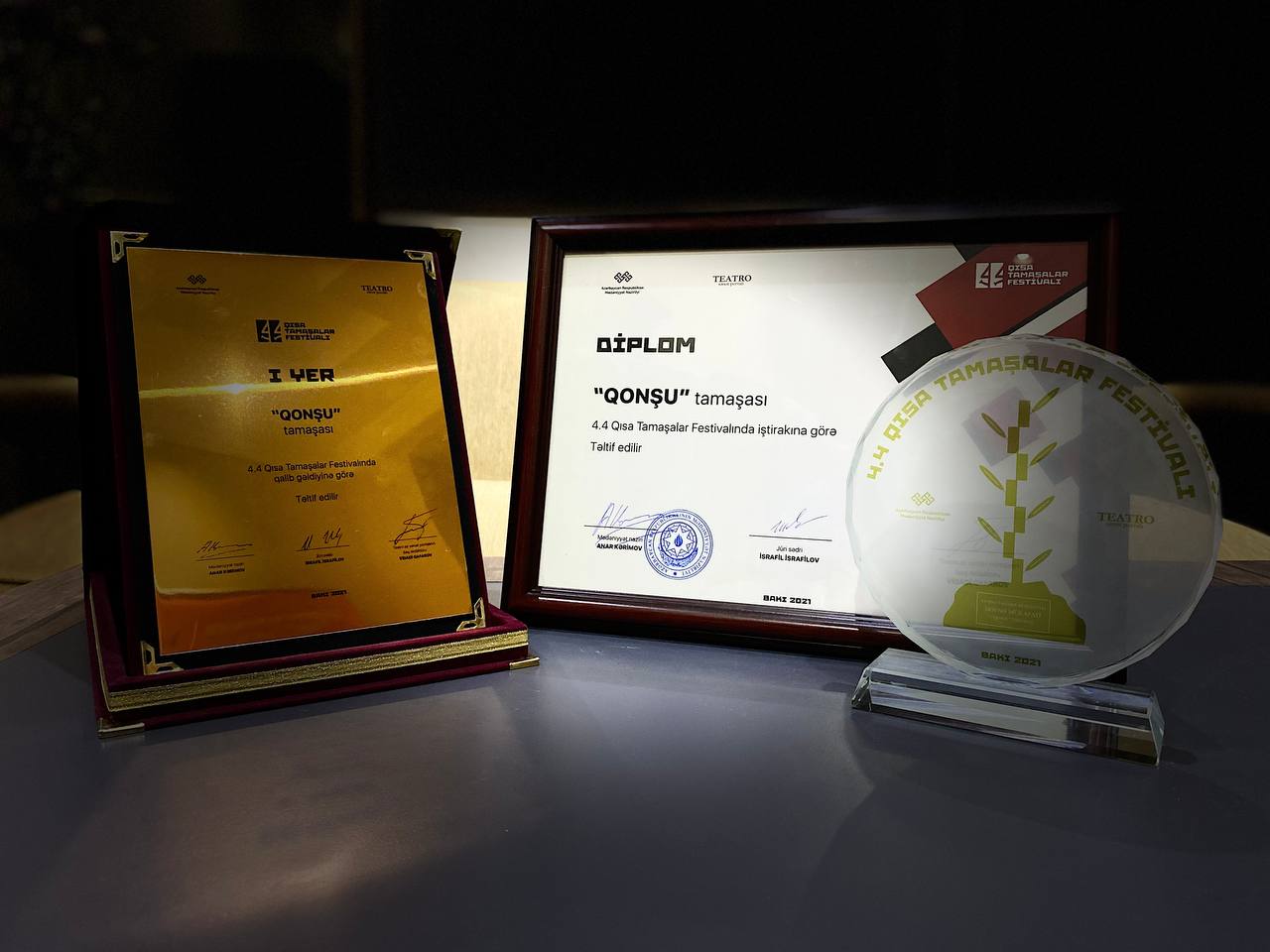 ƏSA Teatrının Xalqımızın 44 günlük Vətən müharibəsində qazandığı zəfərə və bu zəfəri bizə yaşadan şəhidlərimizin xatirəsinə ithaf etdiyi "Qonşu" film-tamaşası Azərbaycan Respublikasının Mədəniyyət Nazirliyi və Teatro.az sənət portalının təşkilatçılığı ilə keçirilən “4.4 Qısa Tamaşalar Festivalı” (QTF) qalibi olub.