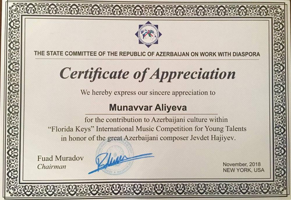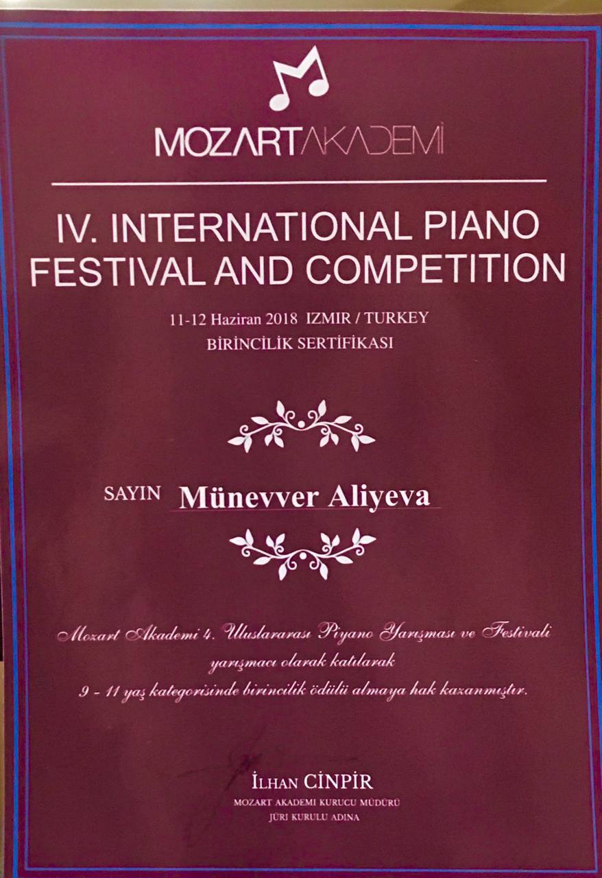2018-ci ilin iyul ayında İzmirdə keçirilən IV Beynəlxalq Piano Festivalında I yerə layiq görülüb.