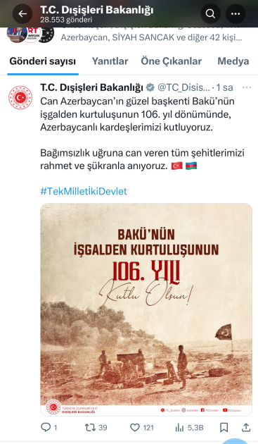 Yeniazerbaycan.com xəbər verir ki, bu barədə Türkiyənin Xarici İşlər Nazirliyinin Bakının daşnak-bolşevik işğalından azad edilməsinin 106-cı ildönümü ilə bağlı paylaşımında bildirilib.