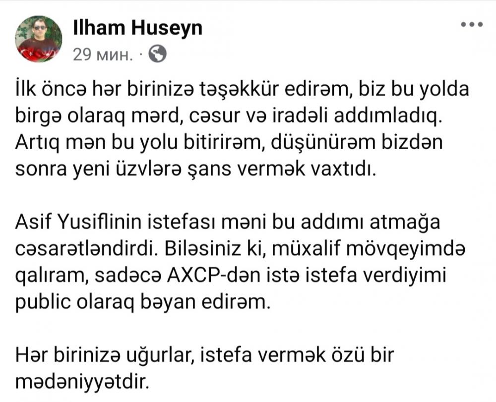 Yeniazerbaycan.com xəbər verir ki, bu barədə o, özünün feysbuk səhifəsində paylaşım edib. İlham Hüseyn istefasının səbəbi kimi AXCP Rəyasət Heyətinin üzvü Asif Yusiflinin istefasının onu bu addımı atmağa cəsarətləndirdiyini bildirib: "İlk öncə hər birinizə təşəkkür edirəm, biz bu yolda birgə olaraq mərd, cəsur və iradəli addımladıq. Artıq mən bu yolu bitirirəm, düşünürəm bizdən sonra yeni üzvlərə şans vermək vaxtıdı. Asif Yusiflinin istefası məni bu addımı atmağa cəsarətləndirdi. Biləsəniz ki, müxalif mövqeyimdə qalıram, sadəcə AXCP-dən istefa verdiyimu public olaraq bəyan edirəm. Hər birinizə uğurlar, istefa vermək özü bir mədəniyyətdir".