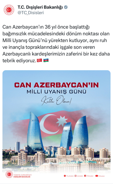 Türkiyə XİN Milli Dirçəliş Günü münasibətilə xalqımızı təbrik edib
