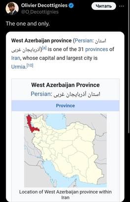Olivye Dekotini İranın Qərbi Azərbaycan vilayətinin xəritəsini “Tək və yeganə” şərhi ilə paylaşıb. Səfirin bu paylaşımı xoş niyyətlə deyil, siyasi qərəzlə etdiyi ortadadır. Məlumdur ki, Azərbaycan ədalət və beynəlxalq hüquq normalarından çıxış etməklə rəsmi Parisin hələ də Afrikada, dənizaşırı ərazilərdə ən eybəcər formada həyata keçirdiyi neokolonializm siyasətinə qarşı kəskin siyasi iradə ortaya qoyur. Ölkəmiz o mövqedən çıxış edir ki, müstəmləkəçilik keçmişin qalığıdır və müasir dünyada bu üzqarası siyasətindən imtina olunmalıdır. Məhz Azərbaycanın təklifləri əsasında yaradılan Bakı Təşəbbüs Qrupunun (BTQ) səmərəli fəaliyyətinin nəticəsi olaraq rəsmi Parisin müstəmləkə ölkələri ətrafında qurduğu informasiya blokadası aradan qalxıb. Buna görə də həm də erməni lobbisinə güclü şəkildə bağlı olan Yelisey Sarayı Azərbaycana qarşı qısqanclıq, heyifçıxma zəminində qarayaxma kampaniyası aparır. Səfirin bəhs olunan paylaşımı məhz bu kontekstdə dəyərləndirilməlidir.