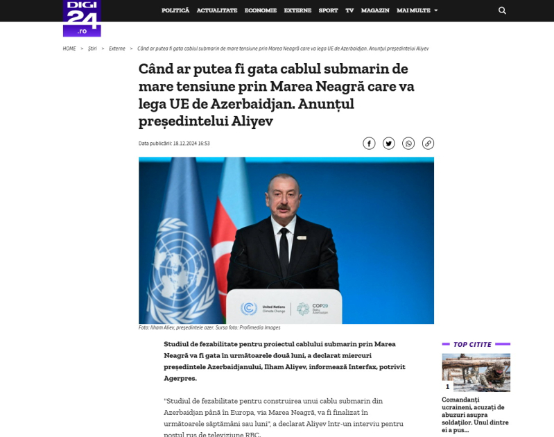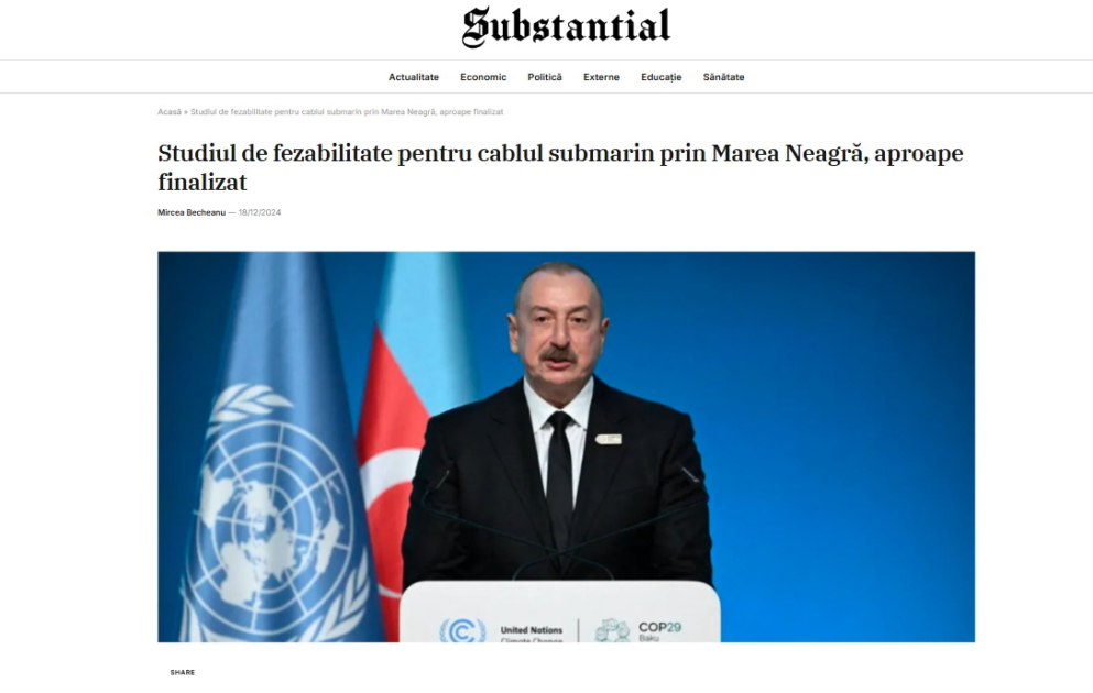 “AGERPRES” milli xəbər agentliyi, “digi24.ro”, “stirileprotv.ro”, “adevarul.ro”, “capital.ro”, “financialintelligence.ro” portalları, “Prima Pagina”, “Ziarul Amprenta” kimi qəzetlər və digər nəşrlər xəbərlərində Prezident İlham Əliyevin müsahibəsində Azərbaycandan Avropaya elektrik enerjisi nəql edəcək sualtı kabelin texniki-iqtisadi əsaslandırılmasının yaxın vaxtlarda tamamlanacağını bildirdiyini qeyd ediblər. “İlkin mərhələdə bu, 4 min meqavatdır, amma Avropa ölkələrinin enerjiyə tələbatını nəzərə alaraq, hətta onların özünün çoxlu investisiya qoymaları baxımından biz bilirik ki, onsuz da bunlara tələbat olacaq”, - deyə media resursları dövlətimizin başçısına istinadla vurğulayıblar.