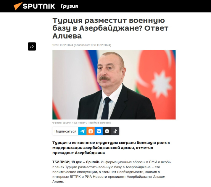 “Sputnik-georgia” isə dövlətimizin başçısının Türkiyə ilə əlaqələr, Azərbaycanda Türkiyənin hərbi bazası ilə bağlı suala cavabını oxucularının diqqətinə çatdırıb. Bildirilib ki, Azərbaycan Türkiyə ilə müstəqilliyini bərpa etdiyi ilk illərdən hərbi əməkdaşlıq edir və bu əməkdaşlıq davam edir.