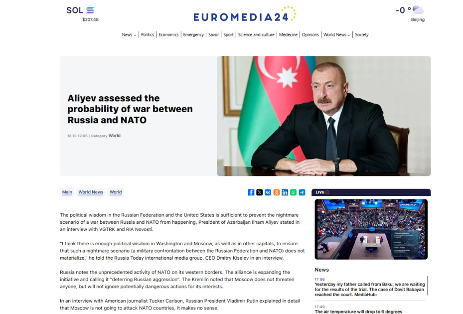 “Euromedia24” portalı bildirir ki, Prezident İlham Əliyev “Rossiya Seqodnya" Beynəlxalq İnformasiya Agentliyinin Baş direktoru Dmitri Kiselyova müsahibəsində Rusiya ilə NATO arasında qorxulu müharibə ssenarisinin baş verməməsi üçün müdrikliyin kifayət etdiyini diqqətə çatdırıb. Portal dövlətimizin başçısının bununla bağlı bu fikirlərini sitat gətirib: “Mən düşünürəm, həm Vaşinqtonda, həm Moskvada, eləcə də digər paytaxtlarda siyasi müdriklik kifayət edəcək ki, belə qorxulu ssenari həyata keçməsin”.