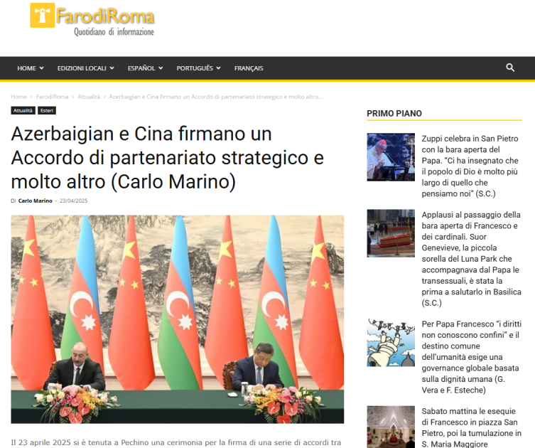 “FarodiRoma”: “Azərbaycan və Çin strateji tərəfdaşlıq sazişi və bir çox başqa sənədlər imzalayıb”