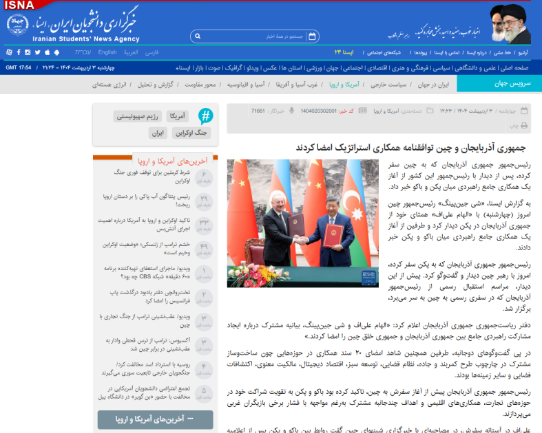 İranın “Tasnim” agentliyinin mövzu ilə bağlı xəbərində qeyd olunur ki, səfər çərçivəsində imzalanan çoxsaylı sənədlər Bakı və Pekinin yeni dövrdə münasibətləri daha da inkişaf etdirmək və mövcud potensialdan hərtərəfli strateji tərəfdaşlıq çərçivəsində istifadə etmək əzmindən xəbər verir. ISNA agentliyi isə yazır ki, Çin Sədri Si Cinpin çərşənbə günü Pekində Azərbaycan lideri İlham Əliyevlə görüşüb və tərəflər Bakı ilə Pekin arasında hərtərəfli strateji əməkdaşlığın başlandığını elan ediblər. “Jahannews.com” nəşri Prezident İlham Əliyevin səfər öncəsi Sinxua agentliyinə müsahibəsində səsləndirdiyi fikirlərdən sitatlar gətirərək, Azərbaycan-Çin münasibətlərinin qədim tarixə və yaxşı ənənələrə söykənərək, yüksələn istiqamətdə inkişaf etdiyini vurğulayıb.