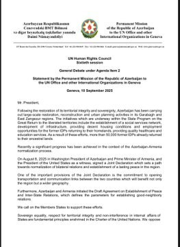 Azərbaycan həm ikitərəfli münasibətlər, həm də beynəlxalq təşkilatlar çərçivəsində fəal xarici siyasət həyata keçirir. Bu baxımdan, ölkəmizin Birləşmiş Millətlər Təşkilatı (BMT) müstəvisində aktivliyi xüsusi vurğulanmalıdır. BMT İnsan Hüquqları Şurasının 60-cı sessiyasında Azərbaycanın bəyanatının səsləndirilməsi bunun göstəricisidir. Bəyanatla bağlı ölkəmizin Cenevrədəki BMT Bölməsi və digər beynəlxalq təşkilatlar yanında Daimi Nümayəndəliyinin “X” sosial media hesabında paylaşım edilib.