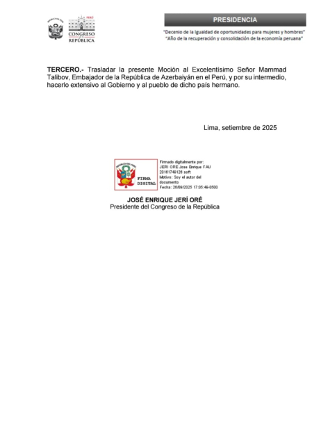 AZƏRTAC xəbər verir ki, Peru Konqresinin sədri Xose Xeri Orenin təşəbbüsü ilə qəbul edilmiş sənəddə Azərbaycanın ərazi bütövlüyü və suverenliyi uğrunda həlak olmuş şəhidlərimizin xatirəsi ehtiramla yad olunur, Azərbaycan xalqına başsağlığı və həmrəylik ifadə edilir.