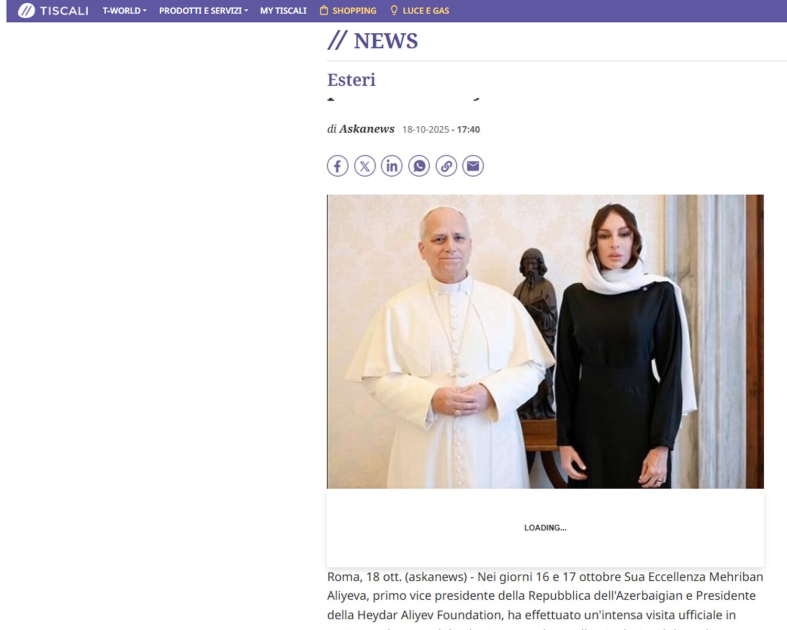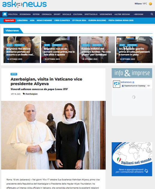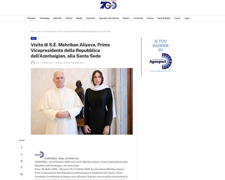 Məqalələrdə, eyni zamanda, Birinci vitse-prezident Mehriban Əliyevanın Vatikan şəhər-dövlətinin qubernatorluğunun prezidenti, rahibə Raffaella Petrini ilə görüşdüyü və birlikdə Vatikan bağlarında ağacəkmə mərasimində iştirak etdikləri, eləcə də Heydər Əliyev Fondunun dəstəyi ilə Vatikanda Müqəddəs Pyotr Bazilikasında həyata keçirilmiş bərpa işləri ilə tanış olduğu, Vatikan Apostol Kitabxanası və Apostol Arxivinə baş çəkdiyi, Vatikanın dövlət katibi kardinal Pietro Parolin ilə birgə Azərbaycanın Müqəddəs Taxt-Tacdakı səfirliyinin inzibati ofisinin rəsmi açılışında iştirak etdiyi diqqətə çatdırılır.