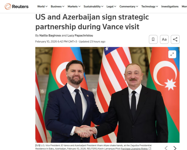 Bununla yanaşı, “Reuters”də dərc olunmuş “ABŞ və Azərbaycan Vensin səfəri çərçivəsində strateji tərəfdaşlıq müqaviləsi imzalayıblar” sərlövhəli yazıda qeyd olunur ki, Azərbaycan Prezidenti İlham Əliyev mətbuata birgə bəyanat zamanı ABŞ və Azərbaycan arasında münasibətlərin bu gün tamamilə yeni mərhələyə qədəm qoyduğunu deyib. Yazıya əsasən, Vens bildirib ki, ABŞ Azərbaycana ərazi sularını qorumaq üçün gəmilər göndərəcək. Vurğulanır ki, Xartiya ilk dəfə avqust ayında Vaşinqtonda Prezident İlham Əliyevlə Prezident Donald Tramp arasında danışıqlarda təqdim olunub.