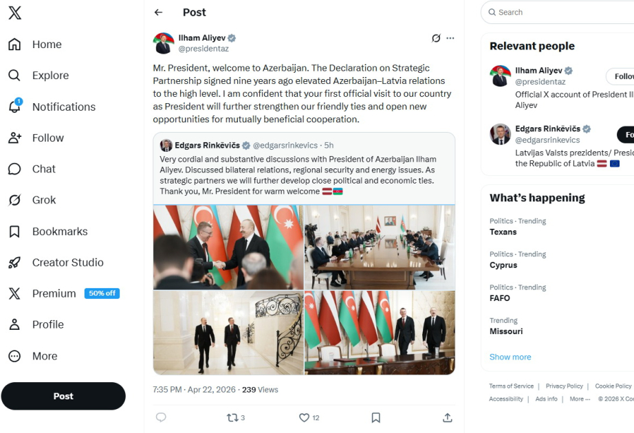 Azərbaycan Respublikasının Prezidenti İlham Əliyev aprelin 22-də Latviya Prezidenti Edqars Rinkeviçsin ölkəmizə səfəri ilə bağlı paylaşım edib.