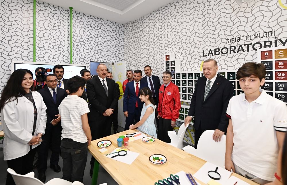 Президенты Ильхам Алиев и Реджеп Тайип Эрдоган побеседовали с учащимися, проводящими опыты в лаборатории.