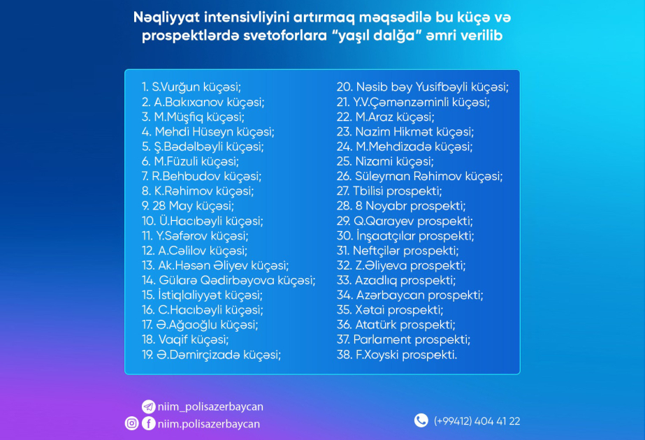 Paytaxtda 38 küçə və prospekt üzrə svetoforlara “yaşıl dalğa” əmri verilib