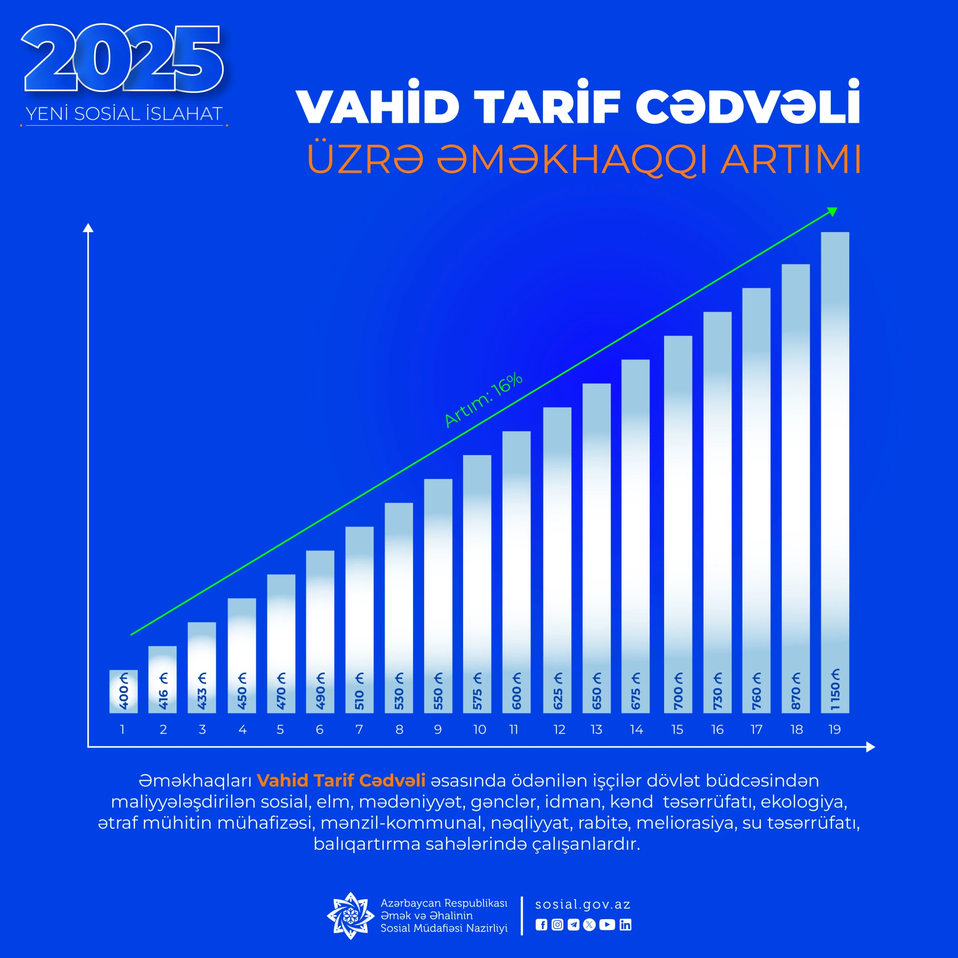 Sosial paket çərçivəsində ən əhatəli artımlardan biri minimum aylıq əməkhaqqının məbləğinin 16 faiz artırılaraq 345 manatdan 400 manata çatdırılmasıdır. Minimum əməkhaqqındakı artım sadəcə aşağı maaş alanların deyil, eləcə də vahid tarif cədvəlinin (VTC) bütün pillələri üzrə əməkhaqlarında artımları təmin edilməkdədir. Belə ki, dövlət büdcəsindən maliyyələşdirilən sahələrdə çalışan işçilərin aylıq tarif (vəzifə) maaşları da təxminən bir ay müddətində bu Sərəncama uyğunlaşdırılacaq və artırılıb. Sosial, elm, səhiyyə, mədəniyyət, gənclər və idman, kənd təsərrüfatı, ekologiya və ətraf mühitin mühafizəsi, mənzil-kommunal, nəqliyyat və rabitə, meliorasiya, su təsərrüfatı və balıqartırma sahələrində çalışan dövlət qulluqçusu statusu olmayan işçilərin də əməkhaqqı artırılıb. Beləliklə, 2025-ci il yanvarın 1-dən 400 manata çatdırılacaq minimum əməkhaqqının yeni əmsalları sayəsində ölkə üzrə 700 mindən çox vətəndaşın əmək haqqının artımı təmin olunur.