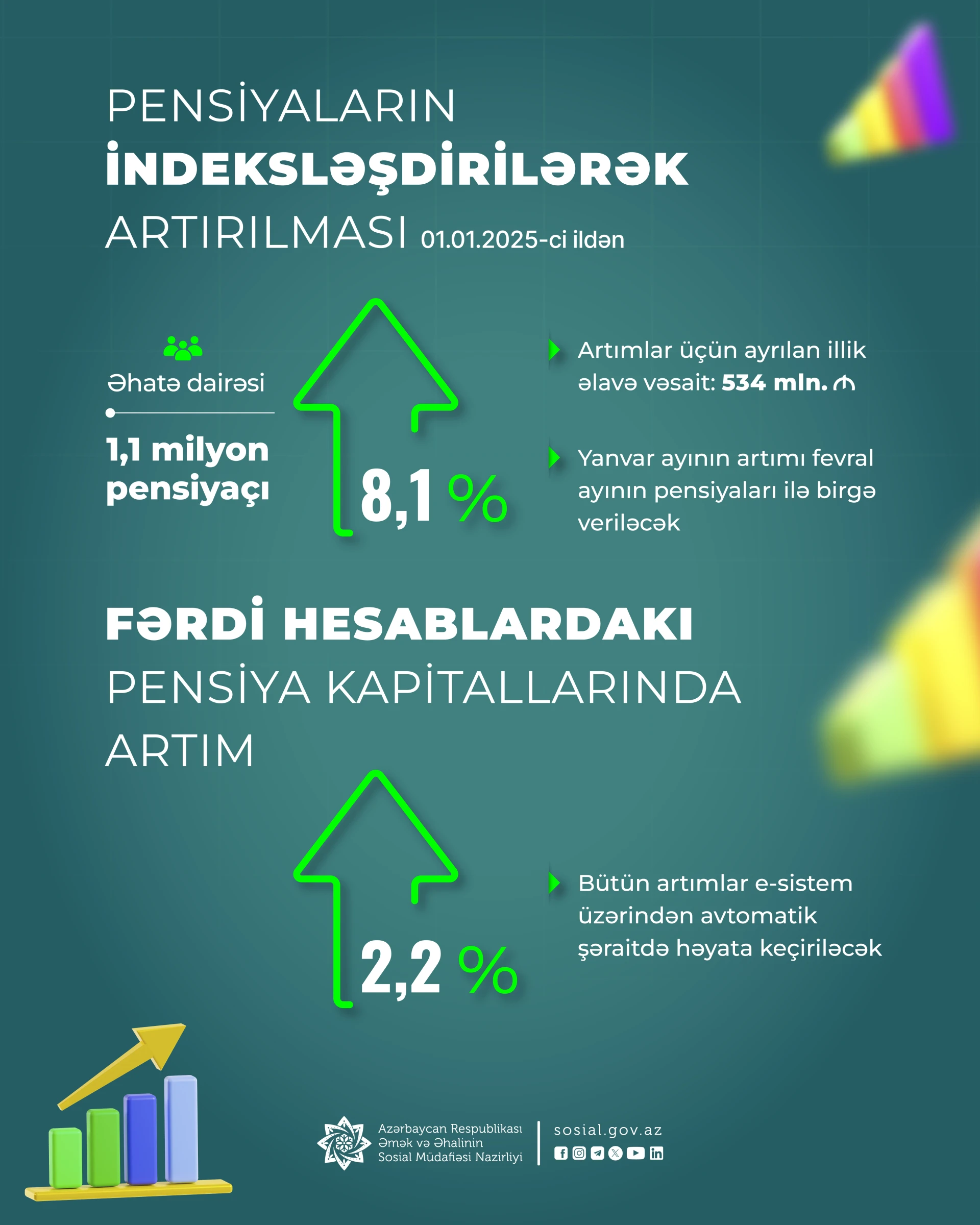 “Əmək pensiyalarının indeksləşdirilməsi haqqında” sərəncama uyğun olaraq, bütün pensiyalar Dövlət Statistika Komitəsinin təqdim etdiyi göstərici üzrə, yəni 2024-cü il üzrə orta aylıq əməkhaqqının 8,1 faiz artımı nisbətində indeksləşdiriləcək. Pensiya artımları pensiyaçıların hər hansı sənəd təqdim etmələrinə, müraciətinə ehtiyac qalmadan, elektron sistem üzərindən avtomatik şəraitdə həyata keçiriləcək.
