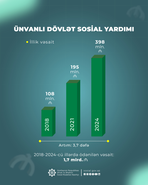 Ünvanlı yardımlar üzrə əhaliyə ödənilən vəsaitlərin illik həcmi həmin dövrdə 4 dəfəyə yaxın artıb və bu istiqamətdə hazırda illik 400 milyon manat ətrafında vəsait yönəldilir. Ümumilikdə 2018-2024-cü illərdə ünvanlı sosial yardım proqramı üzrə əhaliyə 1,7 milyard manat vəsait ödənilib.